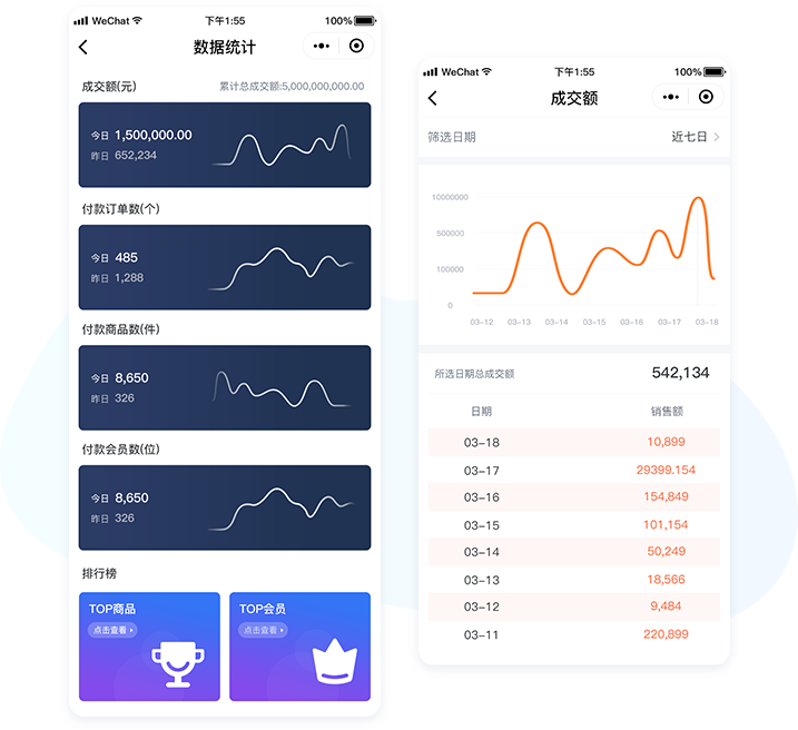 实时查询商品销量排行榜、会员销量排行榜,主动制定运营策略