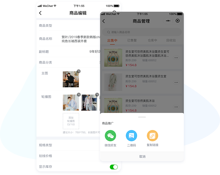 商品推广一键即达,可直接分享微信好友、生成二维码、复制链接